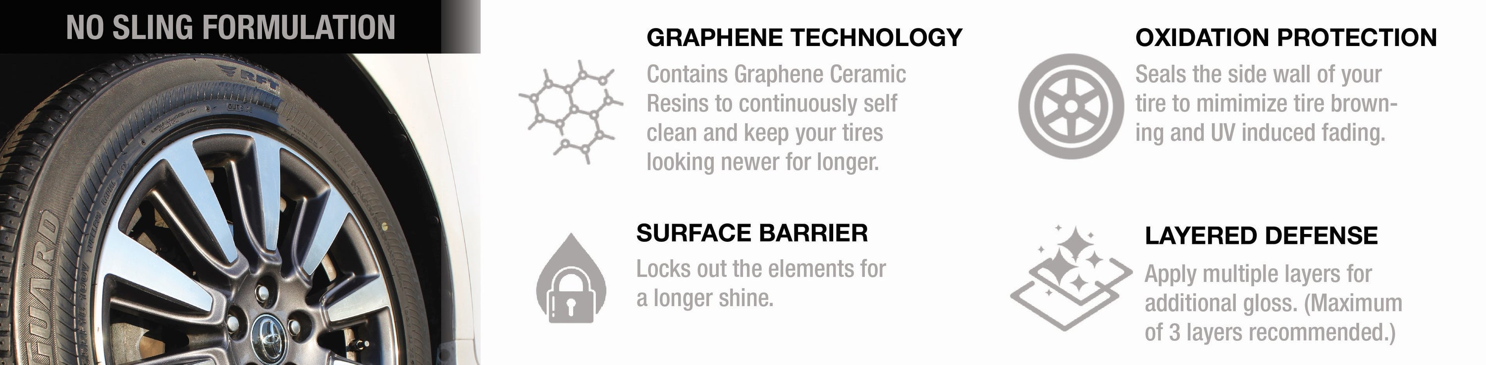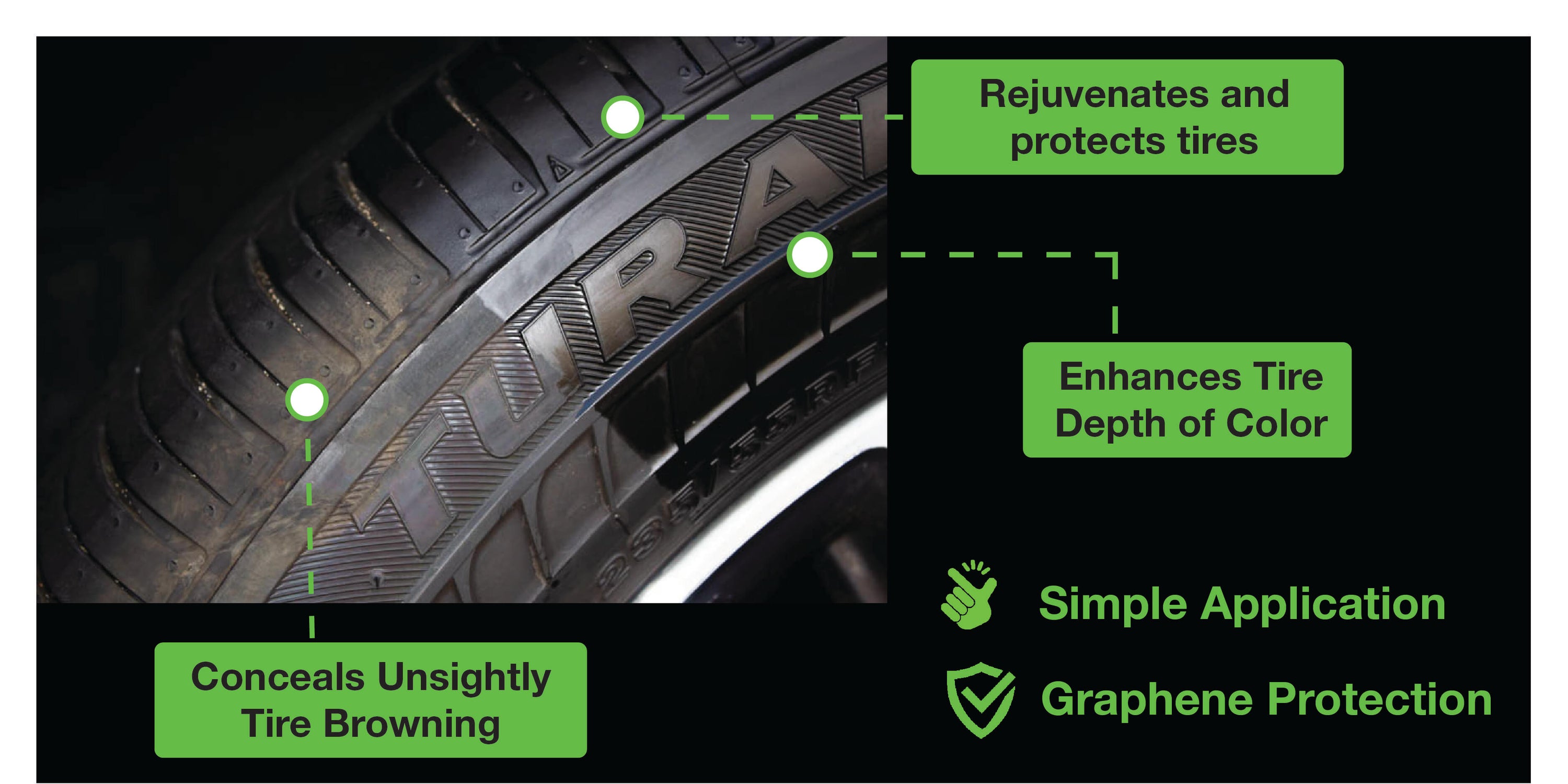 While other products simply work to renew the shine on the tires, our tire dressing works to restore, protect and maintain the shine for a longer period of time. The liquid formula penetrates deep and leaves with a dark black shine. The graphene cures to form a protective layer that shields the "money side" against fading, discoloration and other elemental damage.