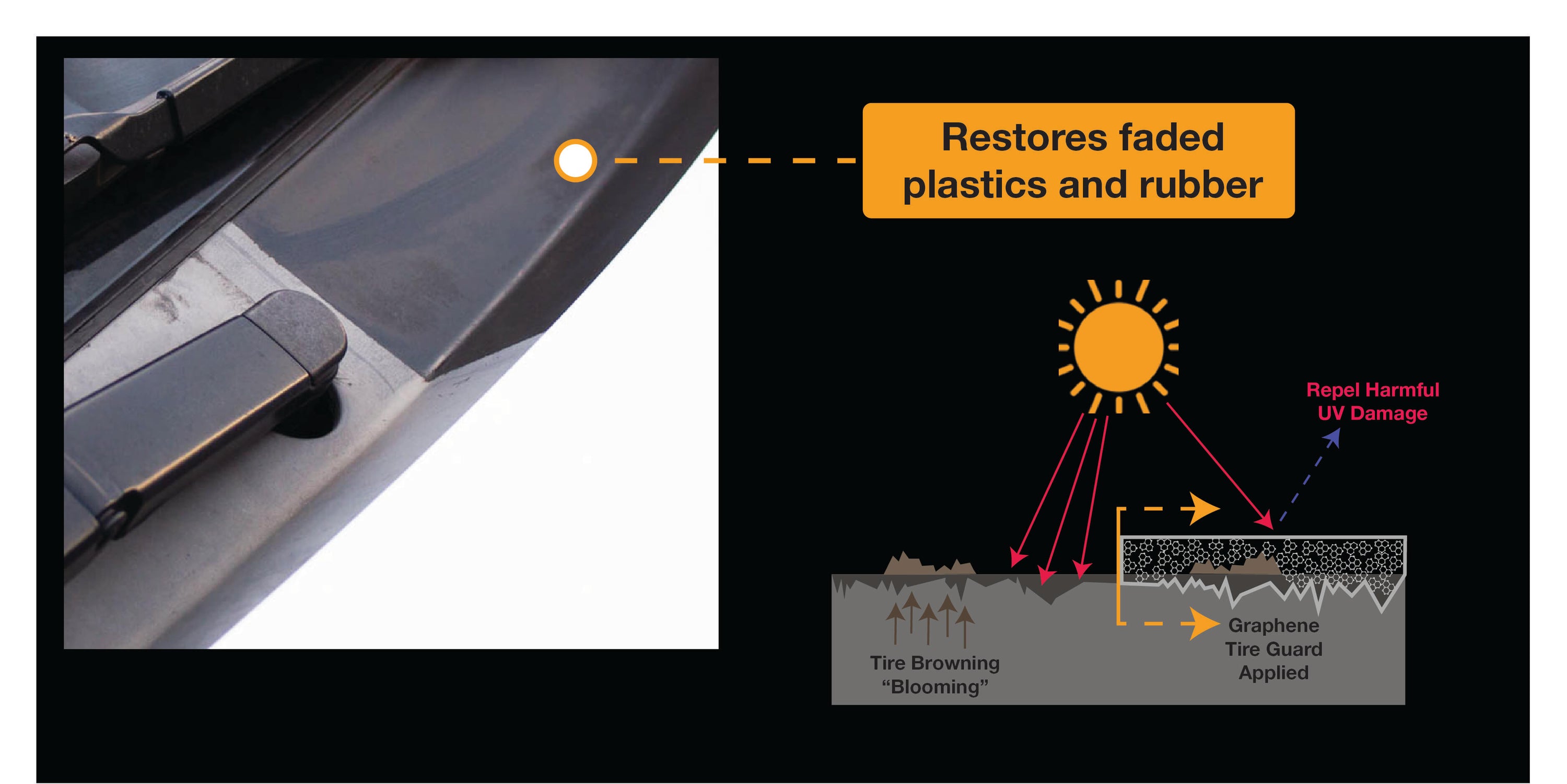Graphene Tire Guard is more than just a tire protectant. At SPARDIANT, we formulate products to be multi-purposed to bring maximum value. Use GTG on faded plastics and rubber to rejuvenate the finish left by years of UV exposure. Our advanced formula mixes cutting edge Graphene technology with tried and true UV protection.